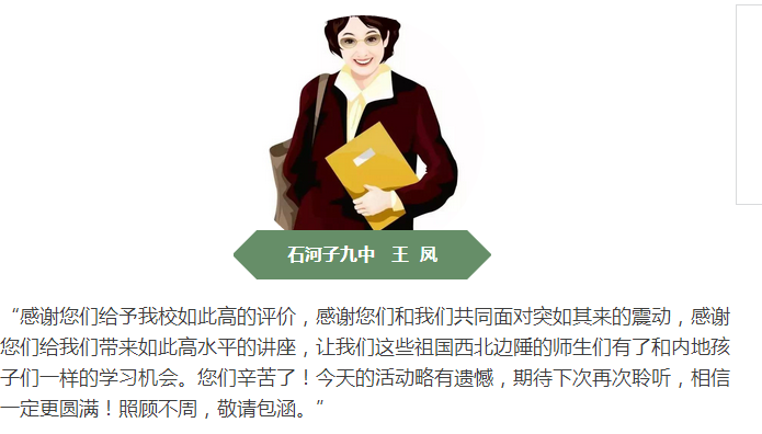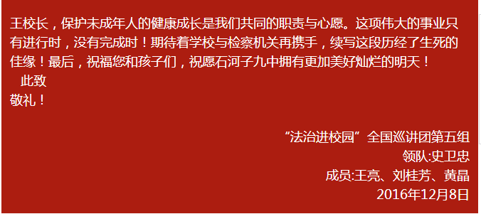 最高人民檢察院未檢辦副主任、公訴廳副廳長(zhǎng)史衛(wèi)忠也帶領(lǐng)全國(guó)巡講團(tuán)第五組全體成員轉(zhuǎn)達(dá)了對(duì)校長(zhǎng)及全校師生的敬意。雙方都表示期待明年再到新疆兵團(tuán),再到石河子九中,給孩子們上完這節(jié)未完成的法治課,給孩子們帶來(lái)更多的精彩。