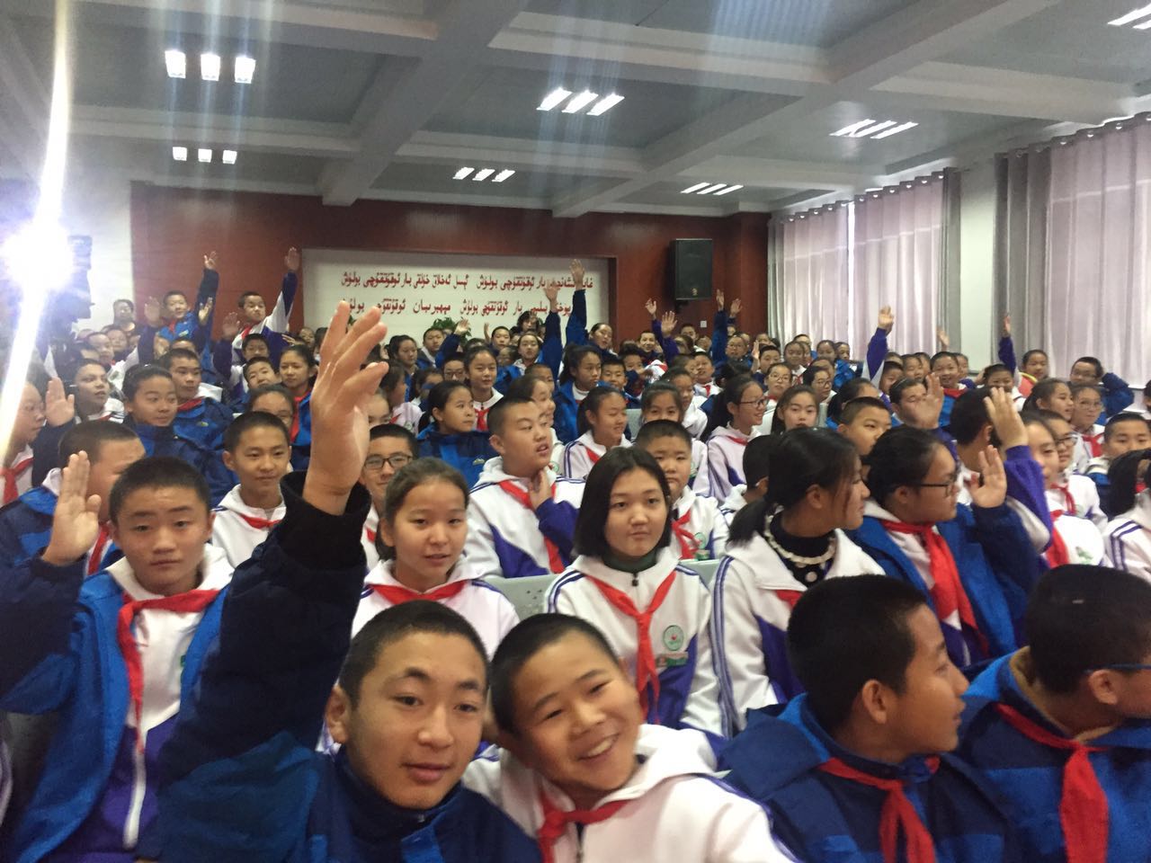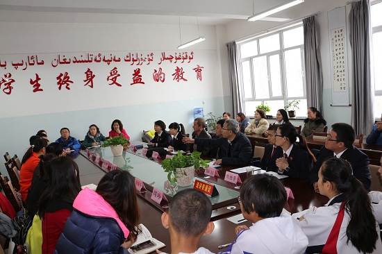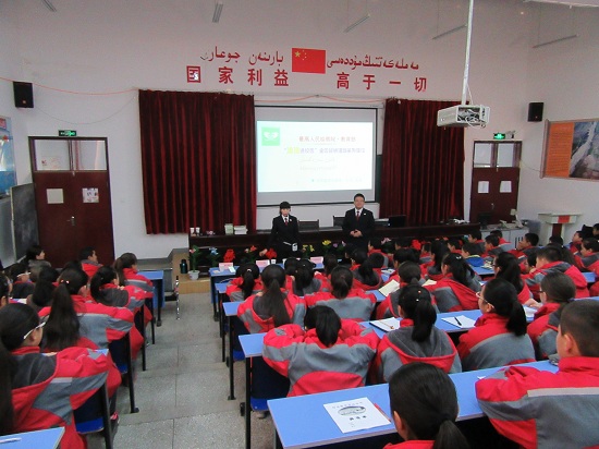 這次的巡講不僅在課件中融入了民族元素,而且巡講團(tuán)的成員中也加入了當(dāng)?shù)厣贁?shù)民族檢察官乃孜福江就去極端化為孩子們進(jìn)行了講解。聽到他們的對(duì)話,我完全聽不懂,就為了和孩子們拉近距離學(xué)的維吾爾族、哈薩克族語(yǔ)中簡(jiǎn)單的您好、再見都讓我很傷腦筋,而孩子們、乃孜福江卻開始學(xué)我說(shuō)起了四川話,還說(shuō)的非常不錯(cuò),語(yǔ)言天賦簡(jiǎn)直太贊了。乃孜福江與我分別用維吾爾族語(yǔ)、漢語(yǔ)一起就反對(duì)校園暴力和同學(xué)們一起進(jìn)行了倡議,人民網(wǎng)進(jìn)行了轉(zhuǎn)播,太酷了。