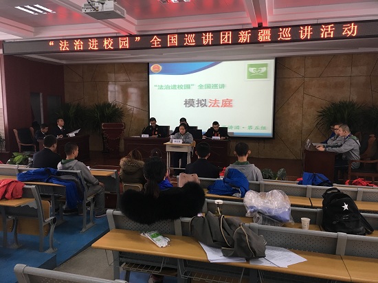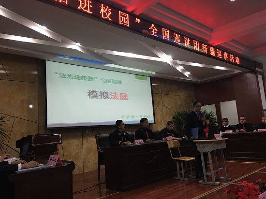 模擬法庭,巡講團(tuán)成員對(duì)參與模擬法庭的同學(xué)進(jìn)行培訓(xùn)。每遍訓(xùn)練大約要耗時(shí)50分鐘,而同學(xué)和老師們整整彩排了5遍。老師們不厭其煩,而同學(xué)們面對(duì)寒冷和饑餓沒(méi)有叫一聲苦。老師們的認(rèn)真鼓勵(lì)著孩子們,孩子們的堅(jiān)持也激勵(lì)著老師。最后一次彩排,孩子們著裝上場(chǎng),不僅已經(jīng)對(duì)臺(tái)詞滾瓜爛熟,而且還有角色發(fā)揮。結(jié)束時(shí),已經(jīng)是晚上8時(shí)許,老師和孩子們都露出了滿意的笑容。模擬法庭彩排何嘗不是一堂別樣的課程。