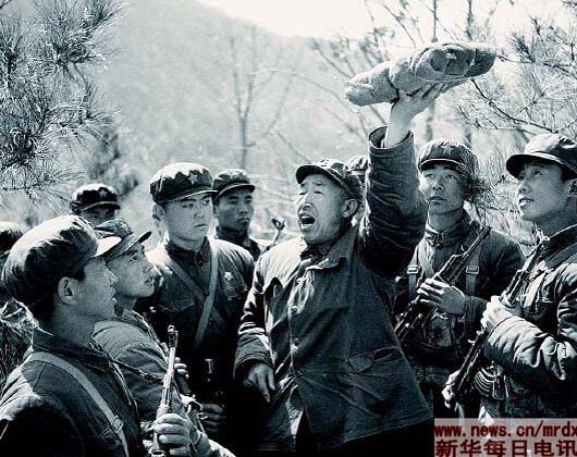 鄒順義(中)為戰(zhàn)士們講述董存瑞舍身炸碉堡的英雄事跡(攝于1978年)。新華社發(fā)