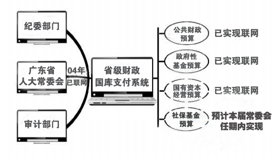 2004年,廣東省人大財(cái)經(jīng)委實(shí)現(xiàn)了與省財(cái)政廳國庫集中支付系統(tǒng)聯(lián)網(wǎng),廣東在全國率先實(shí)現(xiàn)省級(jí)公共財(cái)政預(yù)算支出聯(lián)網(wǎng)監(jiān)督。2010年,省級(jí)和21個(gè)地級(jí)以上市全部實(shí)現(xiàn)了人大財(cái)經(jīng)委與財(cái)政部門、審計(jì)部門的聯(lián)網(wǎng),此外,廣東省人大常委會(huì)不斷拓展預(yù)算聯(lián)網(wǎng)監(jiān)督覆蓋面,推進(jìn)監(jiān)督從公共財(cái)政預(yù)算資金、政府性基金預(yù)算資金擴(kuò)大到國有資本經(jīng)營預(yù)算資金和社保基金預(yù)算資金。