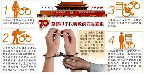 為紀(jì)念中國(guó)人民抗日戰(zhàn)爭(zhēng)暨世界反法西斯戰(zhàn)爭(zhēng)勝利70周年,全國(guó)人大常委會(huì)審議通過(guò)了關(guān)于特赦部分服刑罪犯的決定。百度圖片