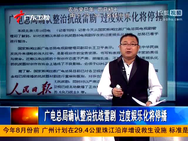 此次,國家新聞出版廣電總局對各衛(wèi)視部分抗戰(zhàn)題材電視劇存在的過度娛樂化現(xiàn)象著手進行整治,前述《一起打鬼子》(原《來勢兇猛》)隨即被要求暫停發(fā)行播出?偩痔岢雒鞔_要求,對衛(wèi)視電視劇黃金檔已報排播的抗戰(zhàn)題材劇進行重審和甄別,對存在過度娛樂化的抗戰(zhàn)劇進行修改,停播不能修改的過度娛樂化抗戰(zhàn)劇,同時對以嚴肅態(tài)度進行創(chuàng)作的抗戰(zhàn)劇給予鼓勵和支持。
