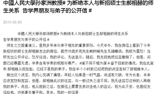 2015年9月20日,中國(guó)人民大學(xué)歷史學(xué)院教授孫家洲發(fā)布一封公開信,信中申明要斷絕與新招碩士生郝相赫的師生關(guān)系。事件源于之前郝相赫同學(xué)曾在自己的微信朋友圈轉(zhuǎn)發(fā)一則點(diǎn)評(píng)北京大學(xué)歷史系學(xué)者的文章,并加以點(diǎn)評(píng)曰:“人大最大的失誤就是不該從這個(gè)垃圾系引入大量的唐宋領(lǐng)域老師……如果不是跟北大歷史系這個(gè)垃圾系合作而是跟南開或者北師大合作的話好太多!辈⒈本┐髮W(xué)閻步克教授、中國(guó)人民大學(xué)韓樹峰老師與澳門學(xué)者李憑先生比較,說前兩者“平庸”。