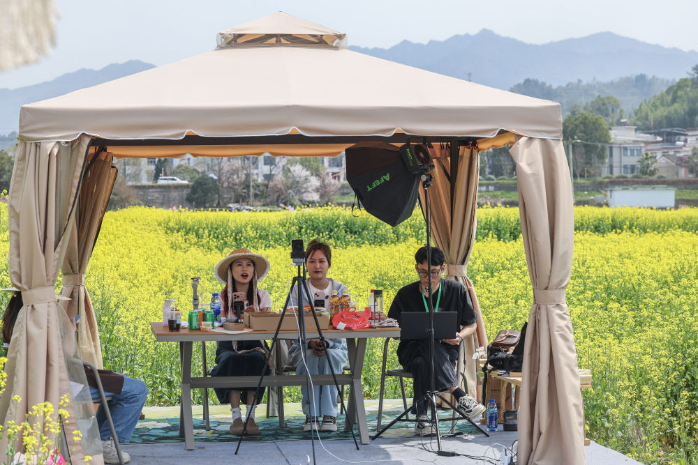 3月23日,主播在浙江建德更樓街道城南城市田園油菜花田邊的直播間內(nèi)推介當?shù)匚穆庙椖俊P氯A社記者 徐昱 攝