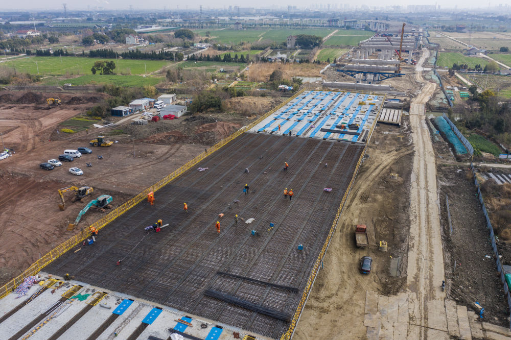 3月7日,在524國道秀洲王江涇至新塍公路工程TJ02標段,作業(yè)人員正在進行60米鋼混組合梁現(xiàn)澆橋面板鋼筋焊接及綁扎作業(yè)(無人機照片)。新華社記者 徐昱 攝
