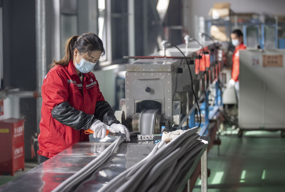 3月27日,在位于寧夏賀蘭工業(yè)園區(qū)的湯姆森電氣有限公司生產(chǎn)車間內(nèi),工作人員制作硅膠絕緣護套。新華社記者 楊植森 攝