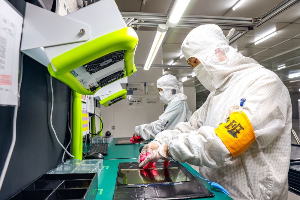 3月21日,在江蘇省江都高新技術產(chǎn)業(yè)開發(fā)區(qū)江蘇和熠光顯科技有限公司,工人在無塵車間作業(yè)。新華社發(fā)(任飛攝)