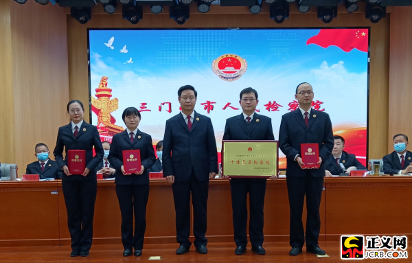 檢察長張建華(右二)領(lǐng)取全省十佳基層檢察院獎(jiǎng)牌。