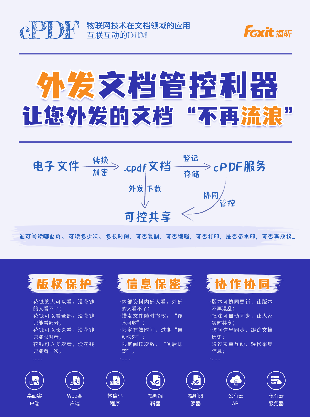 互聯(lián)PDF,簡(jiǎn)稱(chēng)cpdf,是互聯(lián)互動(dòng)的DRM,是物聯(lián)網(wǎng)技術(shù)在版式文檔領(lǐng)域的應(yīng)用,實(shí)現(xiàn)了外發(fā)實(shí)體文檔的動(dòng)態(tài)權(quán)限管理和協(xié)同。該平臺(tái)通過(guò)等保三級(jí)認(rèn)證,使用“云”+“端”的形式,讓不宜擴(kuò)散的文檔與您之間通過(guò)cpdf平臺(tái)賬號(hào)實(shí)時(shí)互聯(lián)起來(lái),cpdf文檔存在哪里都放心、外發(fā)給誰(shuí)都可控,真正做到了敏感文檔兵不卸甲、覆水可收。福昕互聯(lián)PDF包括三大核心組件,其中CPDF互聯(lián)協(xié)同服務(wù)用于權(quán)限管控和內(nèi)部可控共享,CSHARE互聯(lián)分享服務(wù)用于對(duì)外發(fā)布和文檔搜索,CFORM互聯(lián)表單服務(wù)用于在可控范圍內(nèi)收集、匯總較為敏感的信息。CPDF支持公有云SaaS模式、公有云PaaS模式、私有云SaaS模式、私有云PaaS模式。