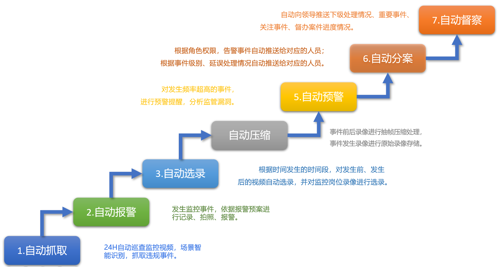 刑事執(zhí)行智能視頻分析檢察監(jiān)督系統(tǒng)通過智能行為分析、肢體動作分析、人臉識別、角色識別等技術(shù),進(jìn)行執(zhí)法行為自動分析與實(shí)時(shí)報(bào)警,減少重復(fù)性勞動成本,提高工作效率,變被動為主動,真正地從事后監(jiān)督轉(zhuǎn)變?yōu)槭虑氨O(jiān)督、事中監(jiān)督。