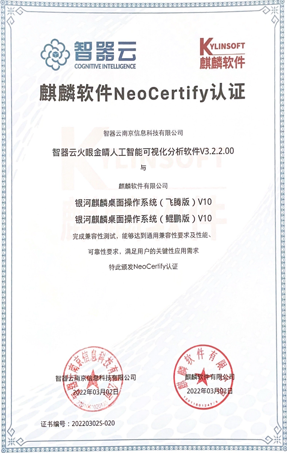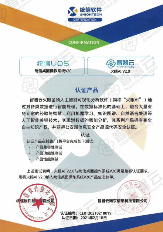 繼2019年智器云自主研發(fā)的火眼金睛完全適配國(guó)產(chǎn)中標(biāo)麒麟操作系統(tǒng)之后。2021年,智器云自主研發(fā)的火眼AI V2.0在國(guó)產(chǎn)硬件、國(guó)產(chǎn)操作系統(tǒng)下的一系列測(cè)試,火眼AI V2.0系統(tǒng)運(yùn)行平穩(wěn)、充分滿足兼容性認(rèn)證。