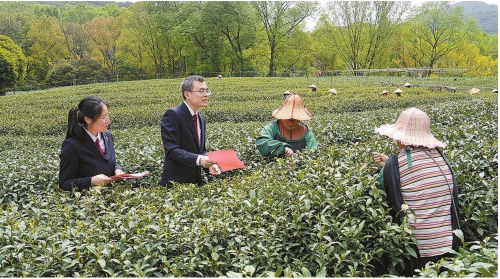 浙江省杭州市西湖區(qū)檢察院檢察官走進(jìn)茶山,結(jié)合辦案向茶農(nóng)宣傳保護(hù)西湖龍井茶知識產(chǎn)權(quán)相關(guān)法律知識。 應(yīng)豪/攝