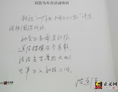 寄語:預(yù)!2009年度中國正義人物”評選活動圓滿成功,社會正氣需要弘揚,道德楷模應(yīng)予表彰,法治光芒普照大地,公平正義永駐人間。