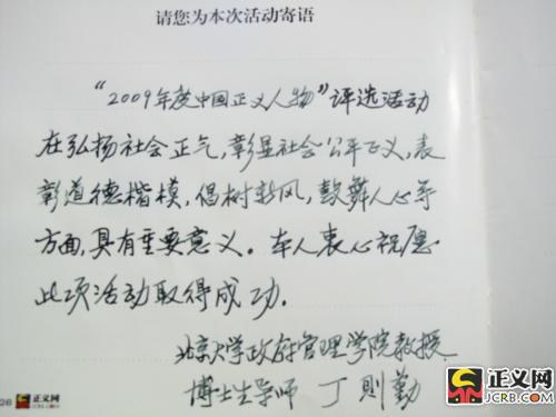 寄語:“2009年度中國正義人物”評選活動在弘揚社會正氣,彰顯社會公平正義,表彰道德楷模,倡樹新風,鼓舞人心等方面,具有重要意思,本人衷心祝愿此次活動取得成功。