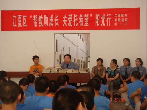 活動中,看守所22名在押未成年人代表整齊端坐在會議室里,聆聽檢察官宣講法律知識。他們眼神中流露出對昨天那些不堪回首往事的悔恨。其后,江夏一中團(tuán)支部書記馬燕代表一中向在押未成年人捐贈圖書200多本,并表示希望他們能在看守所好好學(xué)習(xí),改過自新。最后,團(tuán)區(qū)委青教辦主任金枝和我院團(tuán)支部書記葉鐳主持與在押未成年人的談心交流活動。有很多少年犯主動咨詢法律知識,并表示要好好表現(xiàn),爭取早日重歸社會。