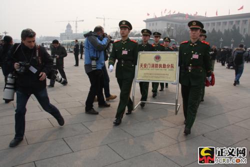 天安門消防執(zhí)勤分隊的戰(zhàn)士們走進天安門廣場馬上吸引了外國記者的目光 本網記者孟澍菲攝