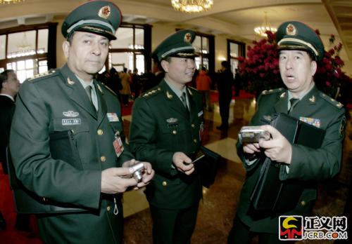 3月9日上午,十一屆全國人大第二次會議舉行第二次全體會議。軍隊代表們在相互交談。
