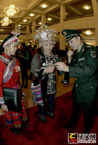 3月9日上午,十一屆全國人大第二次會議舉行第二次全體會議。一名軍人代表為兩名少數(shù)民族代表拍攝后,觀看拍攝的圖片。