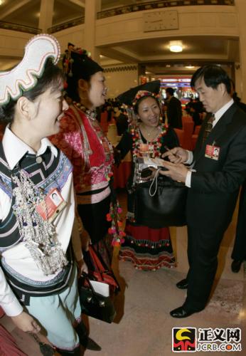 3月9日上午,十一屆全國人大第二次會議舉行第二次全體會議。代表們在相互交談。