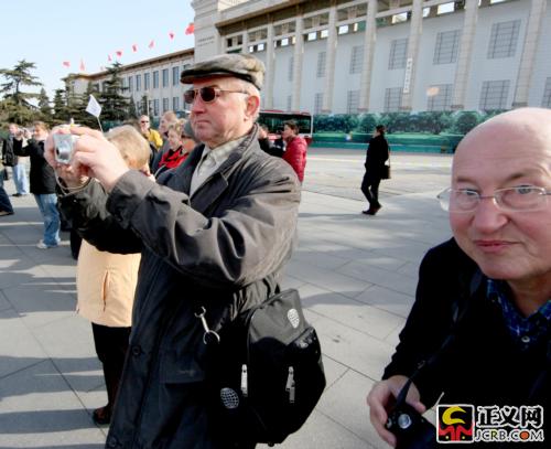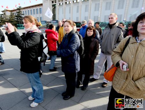 3月9日上午,十一屆全國人大第二次會議舉行第二次全體會議。一個外國旅游團(tuán)的成員在遠(yuǎn)眺和拍攝人民大會堂。