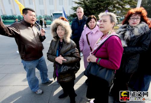 3月9日上午,十一屆全國人大第二次會議舉行第二次全體會議。一個外國旅游團(tuán)的導(dǎo)游在向游客作介紹人民大會堂。