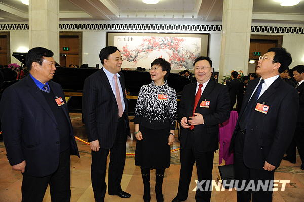 3月13日,第十一屆全國(guó)人民代表大會(huì)第二次會(huì)議在北京人民大會(huì)堂舉行閉幕會(huì)。這是閉幕會(huì)前,全國(guó)人大代表張占宇、譚文華、劉華、裴宏斌、谷文濤(從左至右)在熱烈討論。新華社記者黃敬文攝