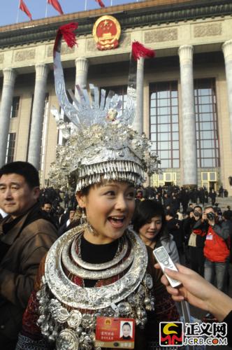 3月5日(星期三)上午9時(shí),第十一屆全國(guó)人民代表大會(huì)第一次會(huì)議在人民大會(huì)堂開(kāi)幕,美麗的貴州代表團(tuán)代表雷阿幼朵剛剛步入會(huì)場(chǎng)就引起記者們的騷動(dòng)。 程丁/攝