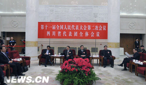 3月11日上午十一屆全國人大二次會議四川代表團舉行全體會議,審議“兩高”工作報告。會后,部分代表接受了集體采訪。圖為四川代表團舉行全體會議。新華網(wǎng) 陳濤 攝