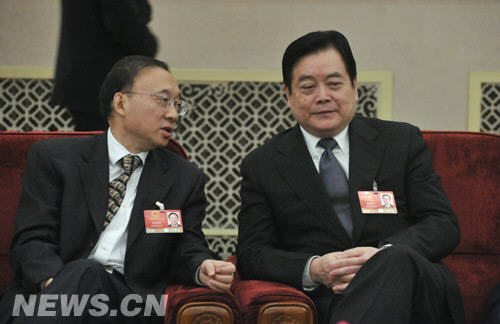 全國人大代表、中共四川省委副書記、省長蔣巨峰(右)與四川省人大常委會副主任甘道明(左)在討論問題。新華網(wǎng) 陳濤 攝