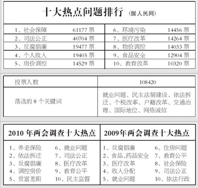 全國兩會將于3月初在京開幕。1月底,人民網(wǎng)推出“2011兩會調(diào)查:你最關(guān)心的十大熱點問題”調(diào)查。截至2月22日22時,共有108420人參與投票,從18個關(guān)鍵詞中選出了“十大熱點問題”(見表格)。