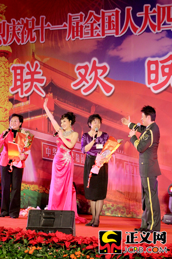 3月9日,兩會(huì)休會(huì)。晚上,吉林代表團(tuán)和江西代表團(tuán)在住地金臺(tái)飯店舉辦慶祝十一屆全國(guó)人大四次會(huì)議勝利召開聯(lián)歡晚會(huì)。三位全國(guó)人大代表和中國(guó)人民解放軍總政歌舞團(tuán)國(guó)家一級(jí)演員、著名通俗歌曲演唱家蔡國(guó)慶共同表演了《同一首歌》。傅偉 攝
