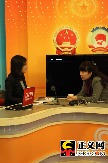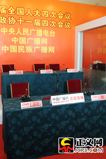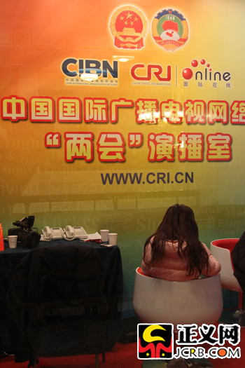 設(shè)在人民大會堂里的新聞直播間。徐伯黎/攝