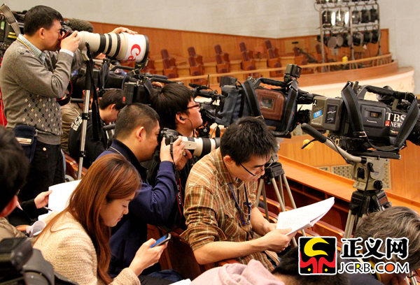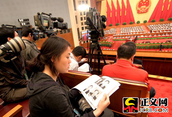 3月11日,十一屆全國(guó)人大四次會(huì)議舉行第三次全體會(huì)議,最高人民檢察院檢察長(zhǎng)曹建明作最高人民檢察院工作報(bào)告。忙碌的記者,有的拍攝、有的看報(bào)告、有的發(fā)短信、有的小憩……傅偉/攝