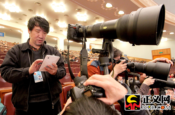 3月11日,十一屆全國(guó)人大四次會(huì)議舉行第三次全體會(huì)議,最高人民檢察院檢察長(zhǎng)曹建明作最高人民檢察院工作報(bào)告。本報(bào)記者肖杰認(rèn)真工作的鏡頭被記者抓拍。傅偉/攝