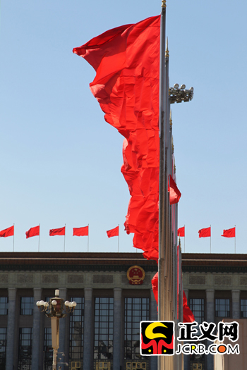 3月3日下午,全國(guó)政協(xié)十一屆四次會(huì)議在北京人民大會(huì)堂開(kāi)幕。(圖為天安門(mén)廣場(chǎng)紅旗迎風(fēng)飄揚(yáng))徐伯黎/攝
