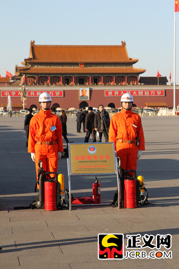 天安門(mén)廣場(chǎng)上值勤的消防戰(zhàn)士。徐伯黎/攝