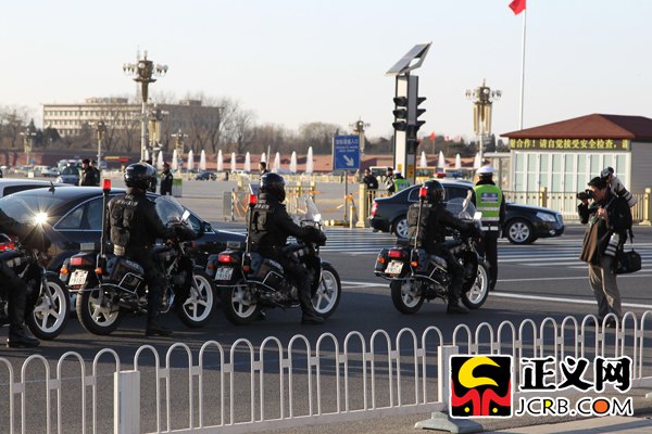 為確保全國(guó)兩會(huì)召開(kāi),武警戰(zhàn)士和公安民警在天安門(mén)廣場(chǎng)進(jìn)行執(zhí)勤、巡邏、巡查工作,為兩會(huì)保駕護(hù)航。徐伯黎/攝