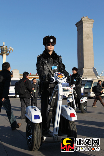 北京天安門(mén)廣場(chǎng)上,輕便漂亮的兩輪警用巡邏車(chē)吸引了人們的目光。徐伯黎/攝