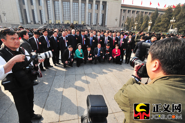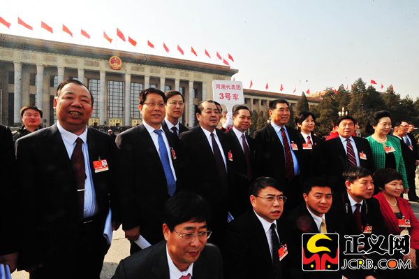 3月11日下午,第十一屆全國(guó)人民代表大會(huì)第四次會(huì)議在人民大會(huì)堂舉行第三次全體會(huì)議,聽(tīng)取最高人民檢察院檢察長(zhǎng)曹建明、最高人民法院院長(zhǎng)王勝俊作工作報(bào)告。圖為河南代表團(tuán)在大會(huì)堂前集體合影留念。程丁/攝