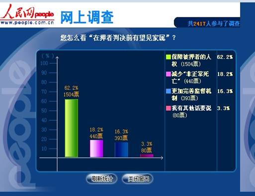 針對(duì)此話題,人民網(wǎng)專門制作了新聞?wù){(diào)查《您怎么看“在押者判決前有望見家屬”?》。截至3月10日14時(shí),共有2417人次參與了調(diào)查。其中62.2%的網(wǎng)友(1504票)認(rèn)為“保障被押者的人權(quán)”;18.2%的網(wǎng)友(440票)認(rèn)為“減少非正常死亡”;16.3%的網(wǎng)友(393票)認(rèn)為“更加完善監(jiān)督機(jī)制”。此外,還有3.3%的網(wǎng)友(80票)選擇“我有其他話要說”。