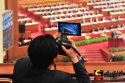 為了拍攝出更具視覺效果的照片,一名攝影記者在大會堂用手機(jī)和相機(jī)同時拍攝。正義網(wǎng)記者程丁 攝