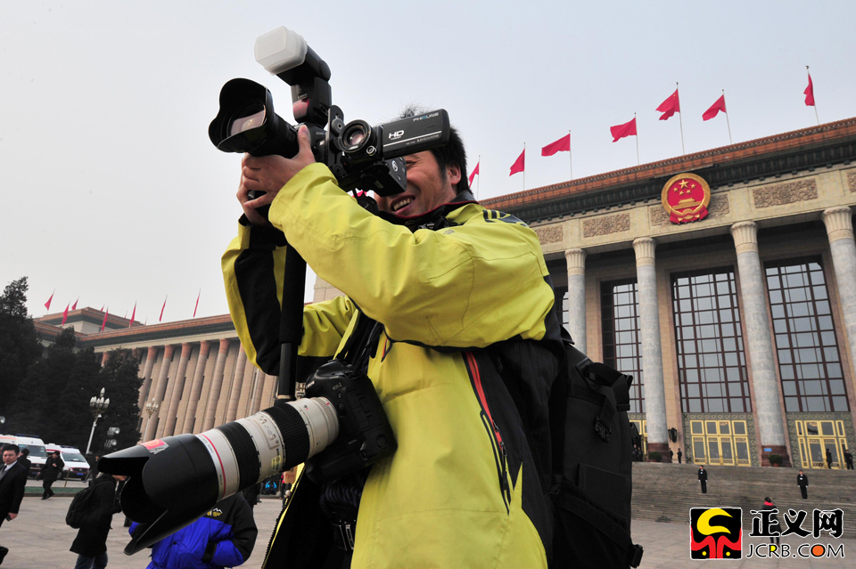 兩會歷年來都是各路媒體征戰(zhàn)的舞臺,今年記者們的新式“武器”也層出不窮。某報社的攝影記者就把相機和DV組裝到一起,在拍攝圖片的同時可錄制視頻資料。正義網(wǎng)記者 程丁 攝