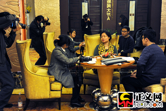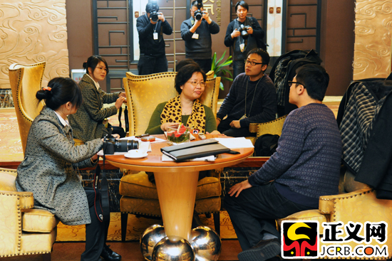 2012年3月12日,湖北代表團代表呂忠梅在審議兩高報告時接受記者采訪。當日,出席十一屆全國人民代表大會第五次會議各代表團審議兩高報告!≌x網(wǎng)記者 肖杰/攝