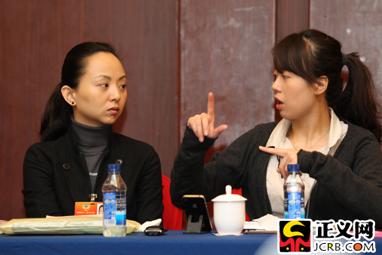 邰麗華委員(左)“聽(tīng)”會(huì)完全靠助手的手語(yǔ)。正義網(wǎng)記者 徐伯黎/攝
