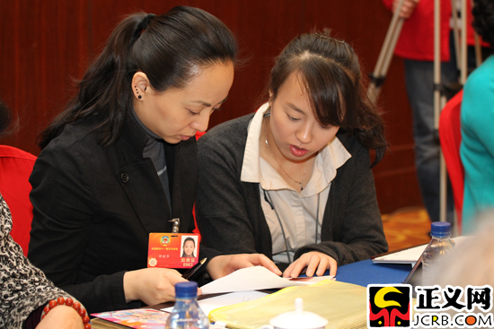 邰麗華委員(左)與助手一起修改小組發(fā)言稿。正義網(wǎng)記者 徐伯黎/攝