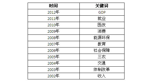 致十年——全國(guó)兩會(huì)政府工作報(bào)告回顧:該欄目分別回顧了從2002-2012這十年間兩會(huì)關(guān)鍵詞的主題變化,詳情如下: