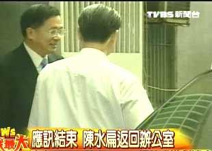 陳水扁3日上午到特偵組,針對(duì)機(jī)要費(fèi)做說(shuō)明,在偵訊逾4小時(shí)之后,陳水扁離開(kāi)特偵組,但沒(méi)有發(fā)表談話,快閃上車離開(kāi)特偵組,回到特偵組對(duì)面的陳水扁辦公室。