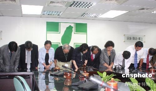 迫于島內(nèi)公眾壓力,臺(tái)灣地區(qū)卸任領(lǐng)導(dǎo)人陳水扁十五日下午發(fā)表書面聲明表示其夫婦退出民進(jìn)黨,民進(jìn)黨傍晚召開臨時(shí)中常會(huì),會(huì)后黨主席蔡英文宣讀聲明稿,表示接受陳水扁夫婦退黨,并帶領(lǐng)所有中常委透過媒體向公眾鞠躬道歉。 中新社發(fā) 曾嘉 攝