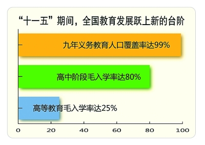 張力:“十一五”期間,全國教育發(fā)展躍上新的臺階,九年義務(wù)教育人口覆蓋率達(dá)99%,接近全面普及;高中階段毛入學(xué)率提升27個百分點,實現(xiàn)了80%的預(yù)期目標(biāo);高等教育穩(wěn)步發(fā)展,毛入學(xué)率從21%增至25%。如果說,新世紀(jì)第一個五年我國初步實現(xiàn)了從人口大國向人力資源大國的轉(zhuǎn)變,到第二個五年末,則可以說這一轉(zhuǎn)變的基礎(chǔ)更為牢靠。